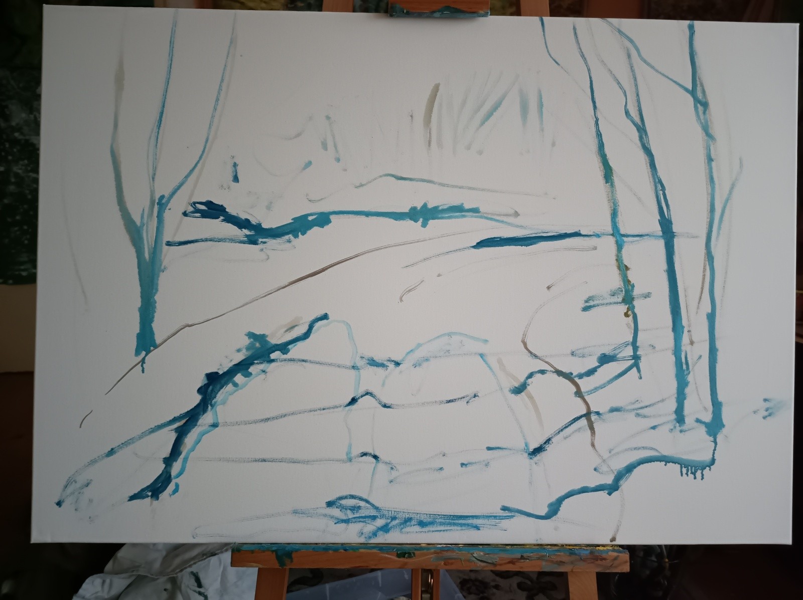 Skica nezabrala dlouho, pár vertikál, pár horizontál, ovály s popisem, abych na něco nezapomněl… Když nemaluji plenér, dělám si často jen velmi schématický nákres s popisky, nic líbivého (třeba tady), pak foto (raději několik ze všech stran a detailů) a pak to chvilku zraje…vlastně není vůbec jisté, jestli z toho něco bude. Pokud ale ano, ne vždy se to může podařit, protože řeka, do které se člověk vrací už není. A není tak možné opakovat viděné, vždy je to jiné.