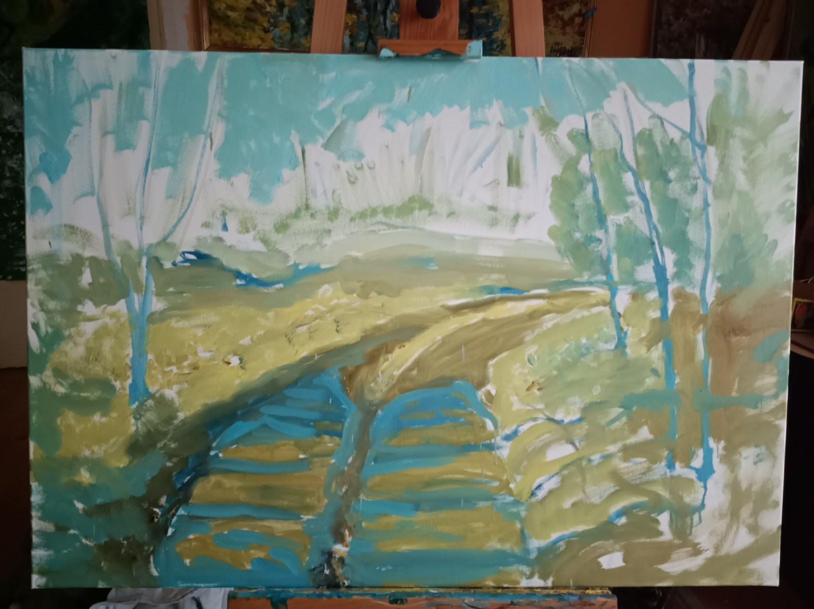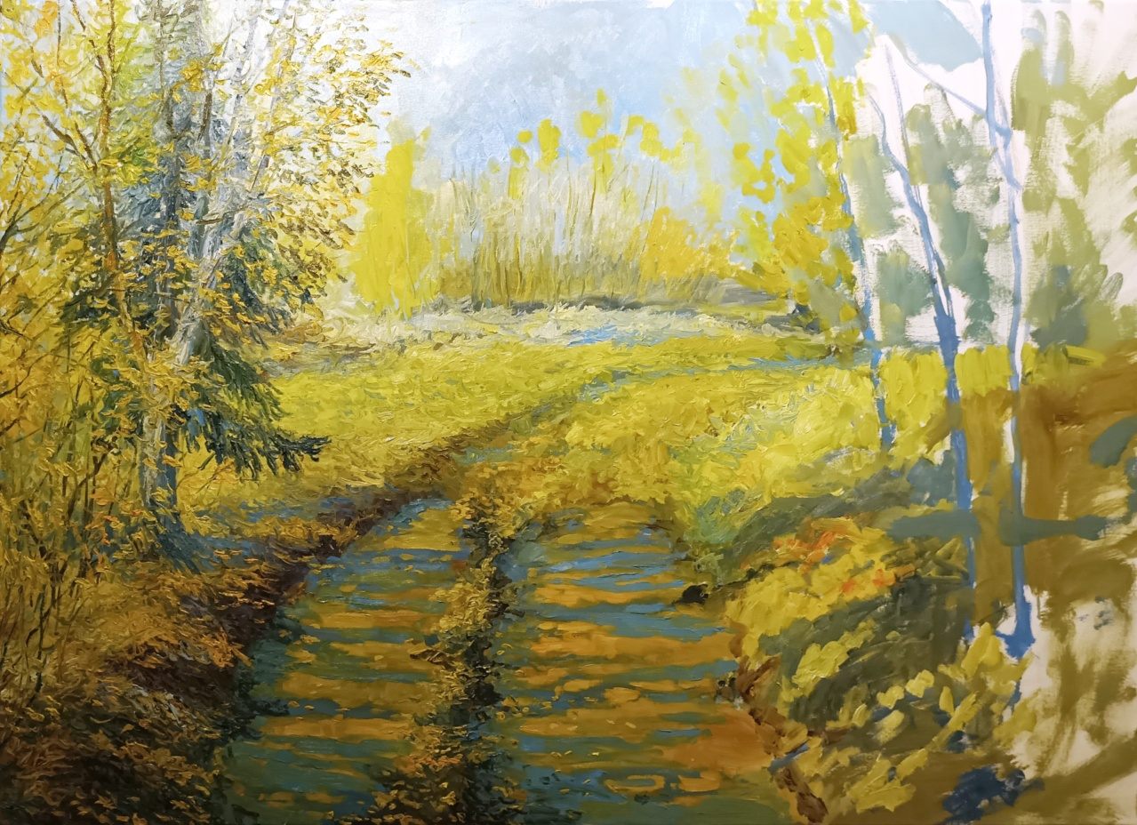 Jo, letošní rok ještě nekončí, ze všech stran se na mě valí práce a stres a já namaloval nejvíc obrazů za poslední možná 4, možná pět let. Mám pocit krize, inspirace, nezvládané prokrastinace, ale plátna, ta pomalovaná, stejně přibývají, a to i ta velká nebo taková ta střední, která mají délku 1 m, jako právě to, které jsem svými titulkem nakousl. Je to cesta, blátivá, výmolnatá, lesní…cesta, která vede k louce, kde se za rohem pasou krávy. Šel jsem po ní asi před měsícem a udělala mi radost tím, co mi v daném dni předvedla. Bahnitá voda s modrými odlesky pod loubím spoře žlutě oděnými osikami a břízami, které část svého šatu již shodily a lehce jím i posypaly hladinu kaluží. Těžko se to popisuje, ale ty příčné blankytné stuhy na rezavé hnědi, ty rozhodly.