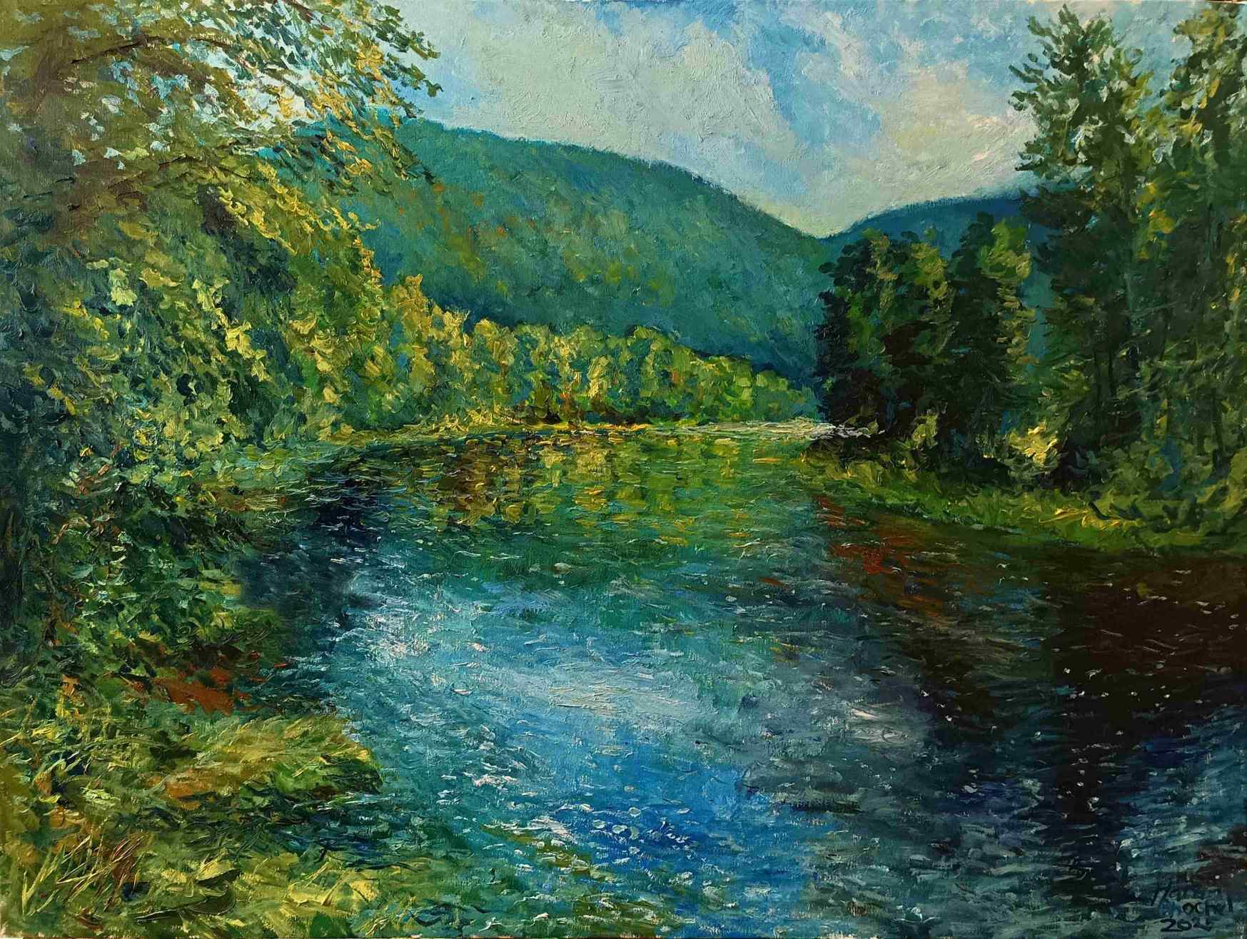 Obraz je ztvárněním nádherného mělkého úseku Ohře v Kynšperku nad Ohří. Ořezem pouze na část osluněné hladiny jsem se dostal až k hranici abstrakce. Voda zde teče líně a vodní rostliny jako zevary a šípatky doslova porůstají její hladinu v celé šíři toku. Kdysi jsem sem jezdil na letní rybářské tábory, kromě řeky jsou tu také nádherná slepá ramena plná línů a okounů a vrátit se mi sem povedlo teprve po 20 letech. I tak to ale stále stojí za to, namaloval jsem tu už 5 obrazů a stále jsem se toho nenabažil.