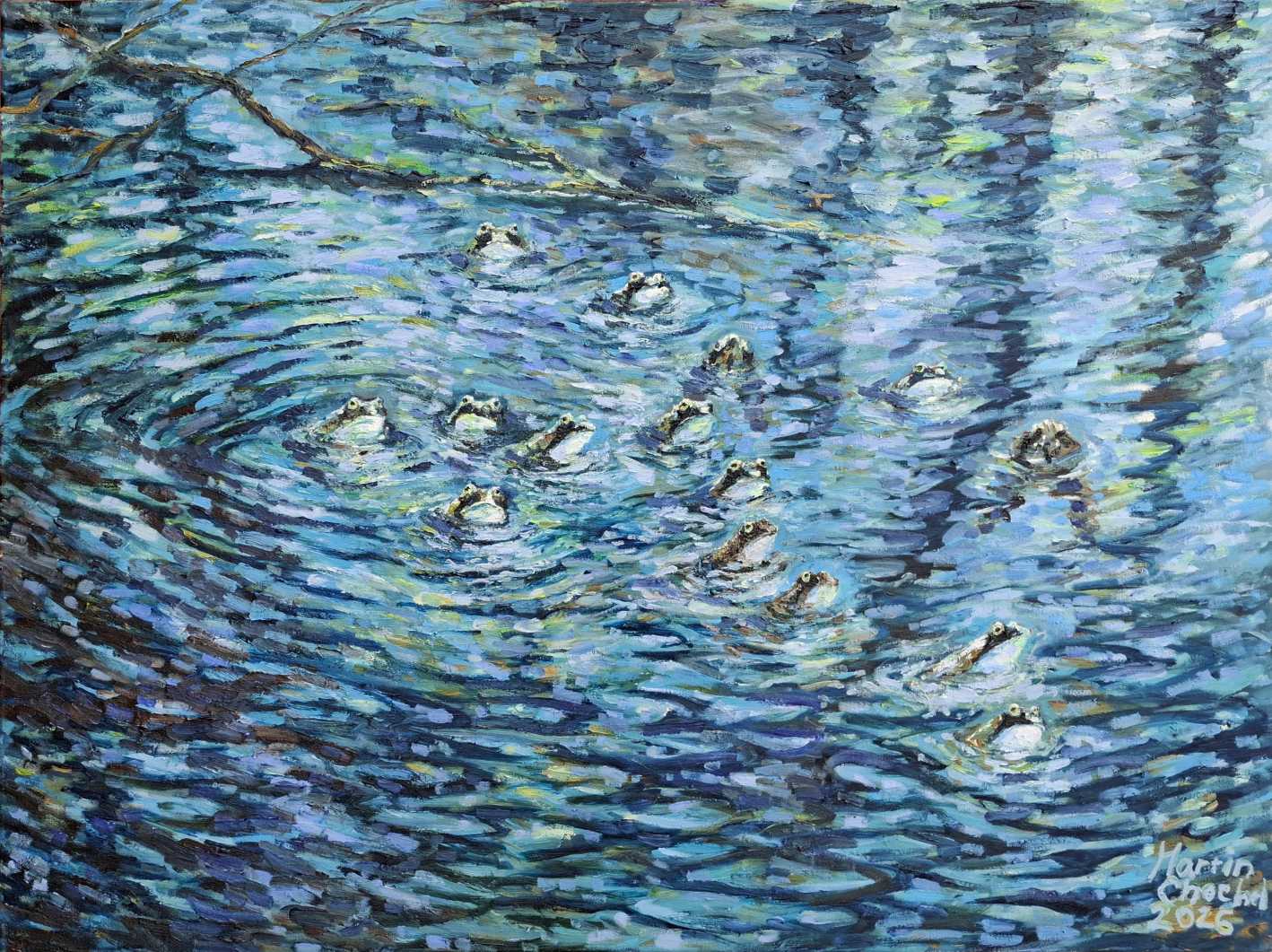 Když člověk sleduje vlnící se hladinu, je to činnost, nad níž zřejmě není, pokud potřebuje zklidnit mysl. Jak ale takový jev zachytit? Fotografie to zčásti umí, ale nezprostředkuje atmosféru tohoto neustále se měnícího média. V obraze je změť skvrn, linek a barev, které samy o sobě vodu nemusí připomínat, proto je tam několik motivů, které pozorovateli řeknou, na co se dívá: odlesk květu leknínu, jezírka vody vyšplouchlá na listy, vlnky kolem listů ... Teď už jen doufat, že i nezávislý pozorovatel toto uvidí...